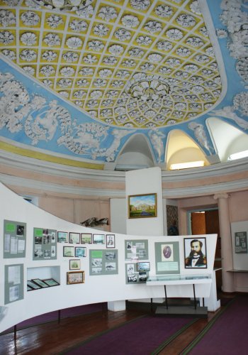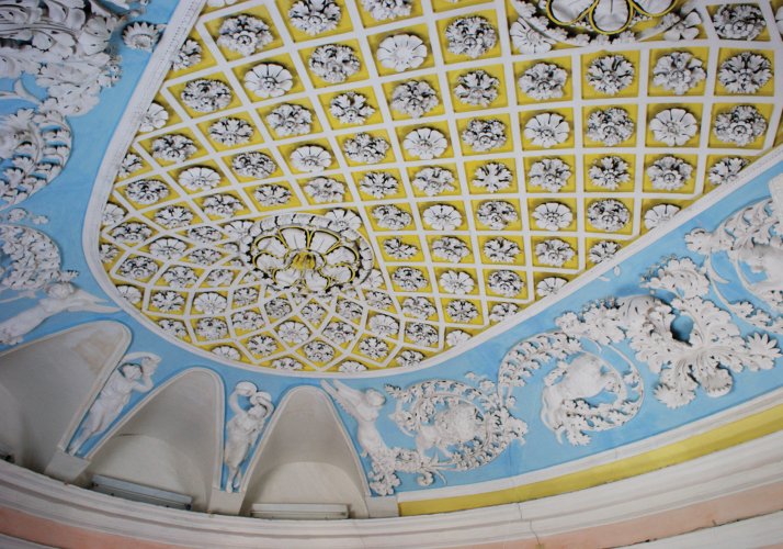 Про мистецьку цінність художнього оздоблення парадних приміщень палацу можуть свідчити дві зали, що збереглися донині в не вельми зміненому стані. Обидві знаходяться в лівому південному крилі, де нині діє музей. Перша з них, овальна. Її покрито розетками у вигляді різних квітів. З двох розміщених по боках великих розеток, скомпонованих із листя дубу й оточених вінком із листя аканта, колись звисали, ймовірно, кришталеві люстри. Плафон оточений широким фризом, в якому як повторювальні мотиви використані звисаючі зі стегна крилатої богині перемоги Ніки гілочки аканта, з вплетеними в них левицею та левом, алегорією сили. Обидва вужчі краї фризу, над дверними отворами, поділені на три трикутні панелі, обрамлені профільованими рамками. Між ними на низьких постаментах стоять: богиня весни Флора, вбрана у квітковий вінок, та богиня вічної молодості Геба, виконуюча на Олімпі роль виночерпія.
