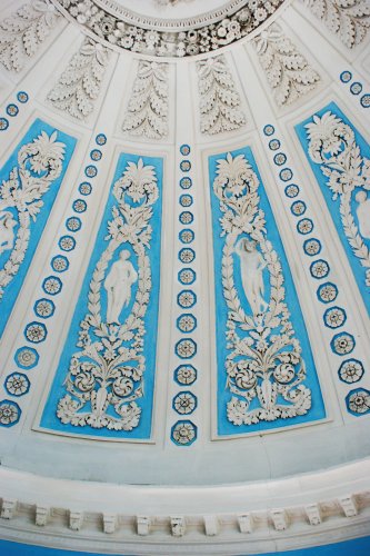 Другий салон – «круглий» – насправді квадратний, однак шістнадцять колон з білого полірованого стюку, розташованих по колу, справляють враження, ніби він має план кола. Склепіння відповідно до числа колон поділено на шістнадцять частин, які звужуються до центру. Їхні рамки прикрашені невеликими розетками, а внутрішня поверхня покрита ліпниною на рослинні мотиви, в які вплетені фігури з античного світу; в центрі – велика розетка з листя аканта, оточена круглим вінком з квітів. Колись звідти звисала люстра.