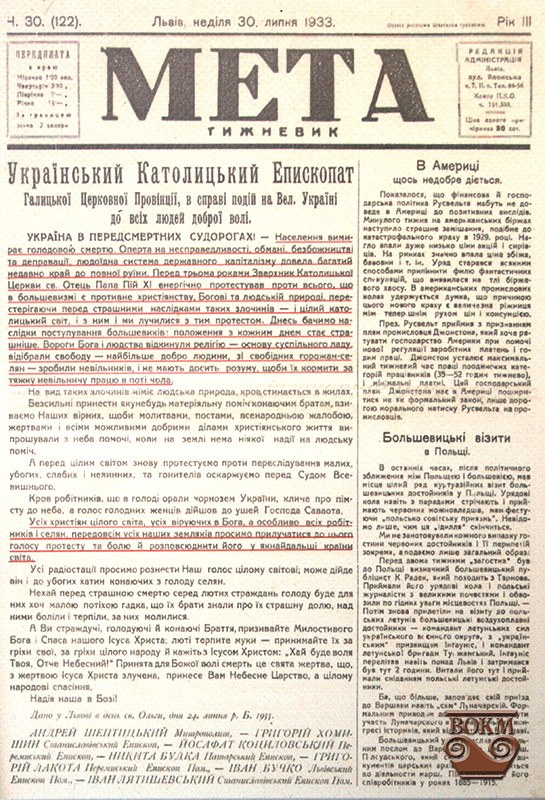 Апогеєм більшовицького режиму в Україні став Голодомор, що охопив Україну восени 1932 р. Українські селяни були проречені на смерть. Місію зі згуртування громадськості для допомоги голодуючим взяла на себе Українська Греко-Католицька Церква. 24 липня 1933 р. весь світ облетіла історична відозва до вірних Галицької Церковної провінції «Україна в передсмертних судорогах», підписана Митрополитом Андреєм Шептицьким та єпископами. У відповідь на звернення 35 українських громадських інституцій створили у Львові Український громадський комітет рятунку України (УГКРУ). Його робота полягала у допомозі тим, кому вдавалося живим перетнути радянсько-польський кордон, зборі коштів для голодуючих, виданні інформаційних брошур та записі розповідей свідків комуністичного свавілля в Радянській Україні.
