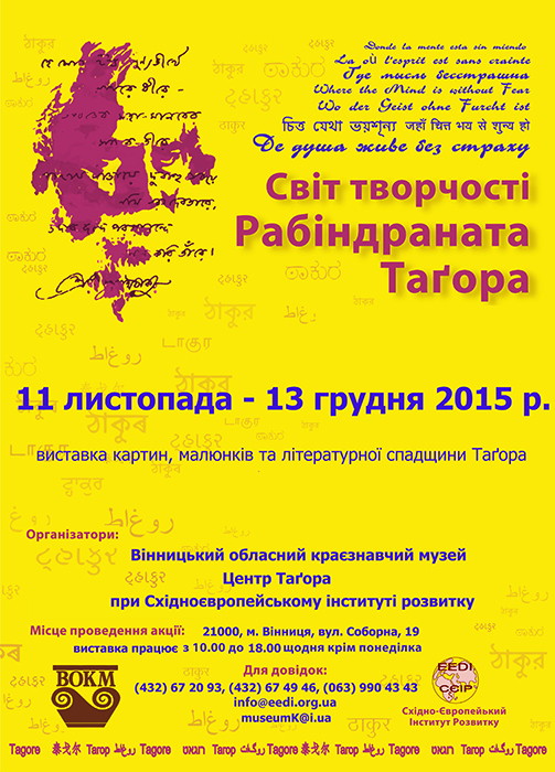 11 листопада 2015 року о 12.00 у академічній залі Вінницького обласного краєзнавчого музею відбулася знакова подія для Вінниці – відкриття виставки «Світ творчості Рабіндраната Таґора: де душа живе без страху…».