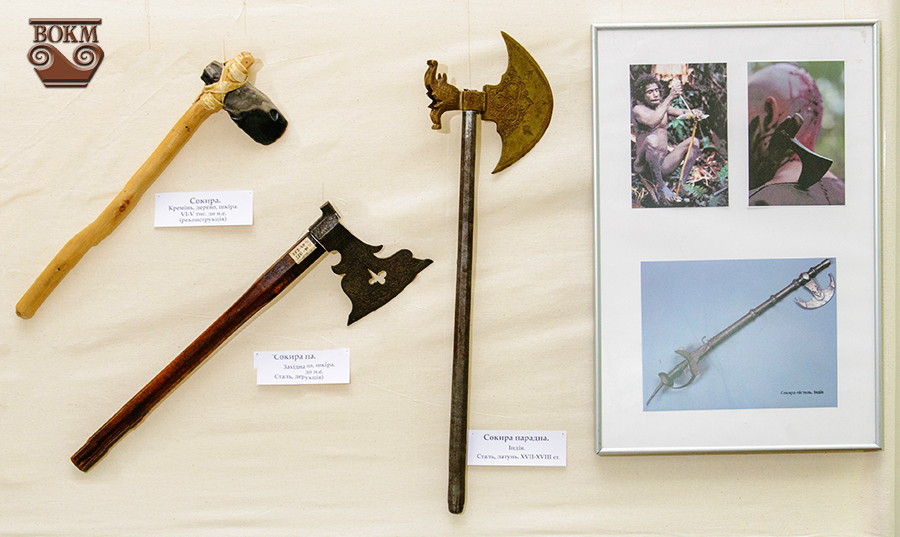 Прямими нащадками рубила можна вважати сокири, які завдяки своїй універсальності, були популярним видом зброї протягом тисячоліть. На виставці представлено зразки від крем’яних сокир часів неоліту (VII-V тис. до н. е.) до чудових парадних металевих сокир доби пізнього середньовіччя та нового часу.
