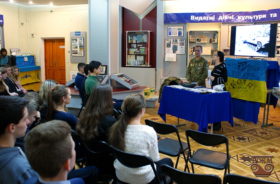 Перед молоддю виступив Мигун Павло Петрович, колишній боєць, командир БМП-2, гвардії сержант 72 Окремої механізованої бригади 2 батальйонно-тактичної групи сектору «М» (маріупольський напрямок). Під час зустрічі демонструвалися кадри авторського документального фільму «Маю честь захищати Україну. 455 днів АТО». Павло Мигун передав музею солдатські обереги, дитячі листи бійцям, прапор 72 Окремої механізованої бригади.