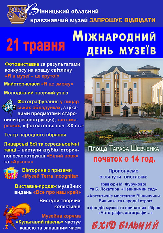 21 травня о 14:00 відбудеться святкування Міжнародного дня музеїв, у рамках якого обласний краєзнавчий та художній музеї нададуть можливість широкому колу громадськості стати учасником численних програм, присвячених цій знаменній події.