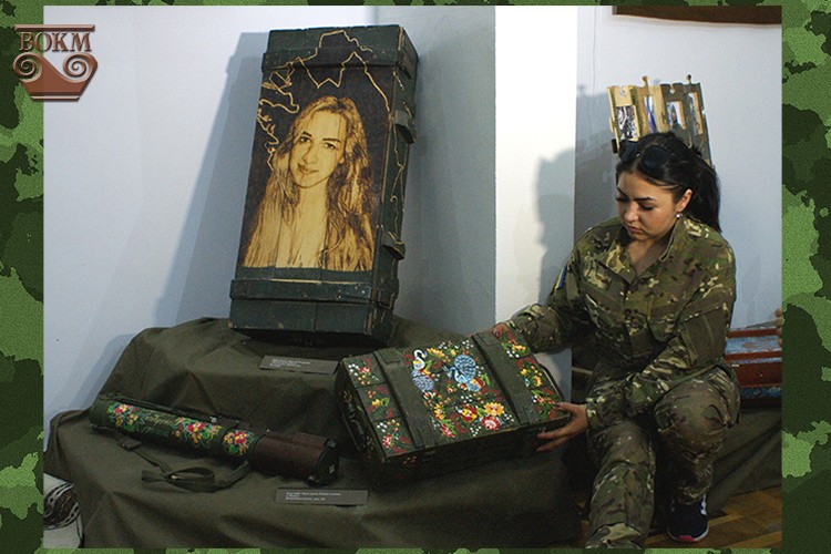 В експозиції представлено понад 200 експонатів. Ящики від боєприпасів, гранатомети, гільзи, технічні засоби, прапори батальйонів, фотографії бійців із передової – все це привезли із зони АТО, а майстри з усієї України перетворили на унікальні мистецькі витвори. Наприклад, гранатомет, розмальований яскравими квітами, або захисна каска бійця з українським орнаментом. А ящики, в яких ще недавно був смертоносний вантаж, оздоблені українською народною різьбою, інші – розмальовані квітами, геометричними орнаментами, які нагадують український рушник, хтось намалював на такому ящику портрет дівчини. Присутні вироби із соломи та рогози: круторогий баран ніби насупився на ворога і тримає напоготові гранатомет.
