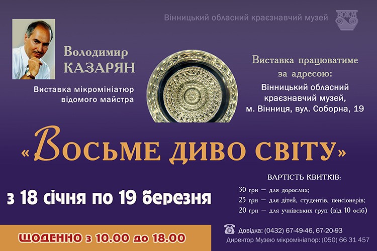 Виставка мікромініатюр «Восьме диво світу» Володимира Казаряна – це справжній подарунок всім мешканцям та гостям міста, це справжнє свято радості і здивування для всієї родини. Запрошуємо Всіх поціновувачів прекрасного відвідати виставку і насолодитися неперевершеними творіннями сучасності!