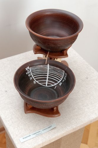 Більш незалежним від погоди і денної пори був інший давній спосіб вимірювання часу – водяний годинник, або клепсидра (з давньогрецької – «та, що краде воду»). Найпростіший варіант клепсидри принципово подібний до відомих сьогодні пісочних годинників. Такий пристрій складається з двох, розташованих одна над одною посудин. Верхня посудина містить отвір. У неї наливається вода, яка потім стікає у нижню посудину за певний проміжок часу. Модель такого годинника експонується на виставці, тож відвідувачі зможуть на власні очі побачити як «спливає час».
