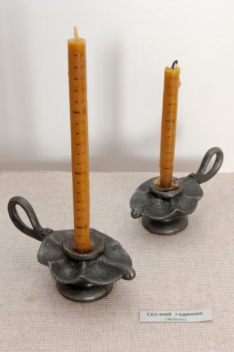 Іншим давнім способом вимірювання часу були вогняні годинники. Давньокитайським варіантом такого годинника була підвішена тліюча спіраль намистинами, що прикріплені на однаковій відстані. По мірі згорання спіралі, намистини із дзвоном падали на металеву тацю, відміряючи таким чином час. У середньовіччі подібний спосіб відмірювання часу поширився і у Західній Європі. Найпростіший варіант – свічка з нанесеними поділками часу, за який вона плавиться при горінні. Модель такого невигадливого пристрою експонується на виставці. Існували і варіанти годинників-лампадок: у них часові поділки були нанесені на ємність з маслом, рівень якого зменшувався у процесі згорання.