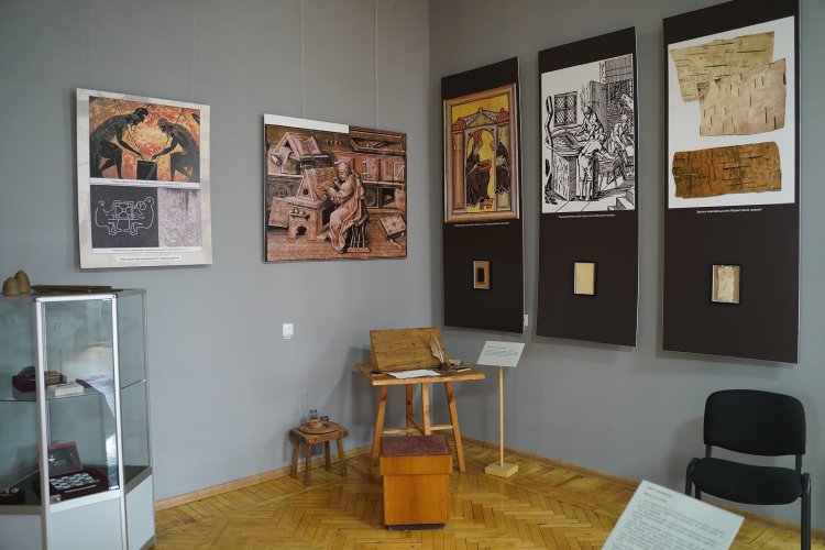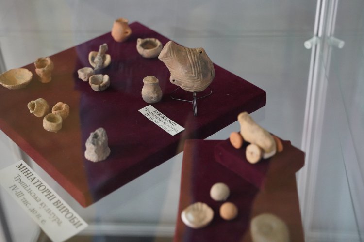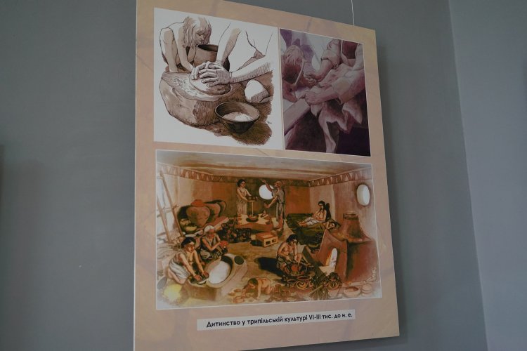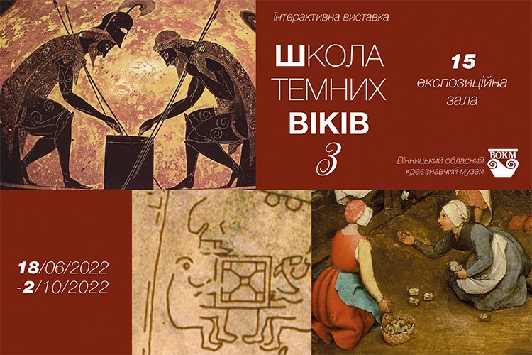 Хронологічно виставка охоплює період від кам’яної доби до перших свідчень існування писемності у середньовіччі. Відвідувачі «Школи темних віків» можуть побачити археологічні матеріали з фондової збірки ВОКМ. Це іграшки та мініатюрні вироби трипільської культури ІV–III тис. до н. е., скіфського часу VI–V ст. до н. е, зарубинецької культури ІІ ст. до н. е. – ІІ ст. н. е., слов’ян VІІІ–ХІ ст. З-поміж археологічних матеріалів, представлених на виставці, – жетони та окуття гральної дошки, виявлені у 2017 р. під час розкопок пам’яток черняхівської культури ІІІ–ІV ст. н. е. у колишньому Липовецькому районі. Унікальні експонати – перші свідчення існування алфавітного письма на наших теренах: предмети, позначені монограмами та написами, а також засоби для письма часів середньовіччя.