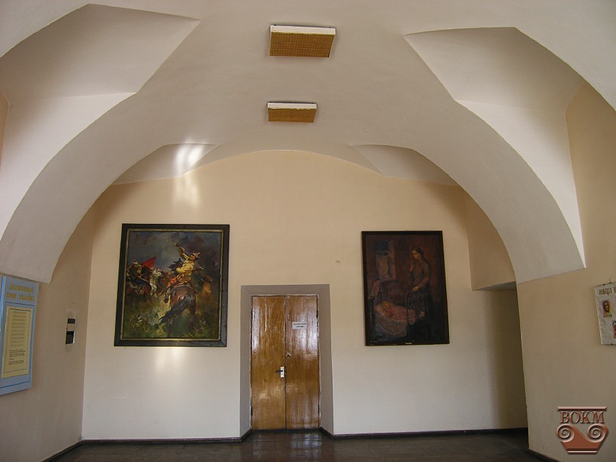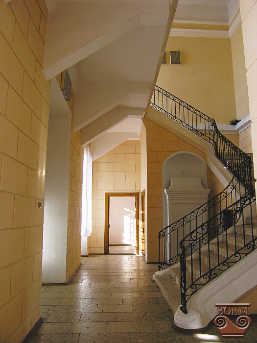 Планування палацу анфіладне. Архітектурне оздоблення інтер’єрів збереглося лише у головному вестибюлі. Широкі сходи ведуть на другий поверх, де були парадні зали. Деякі споруди садиби виходили фасадами на вулицю і належали до забудови міста.