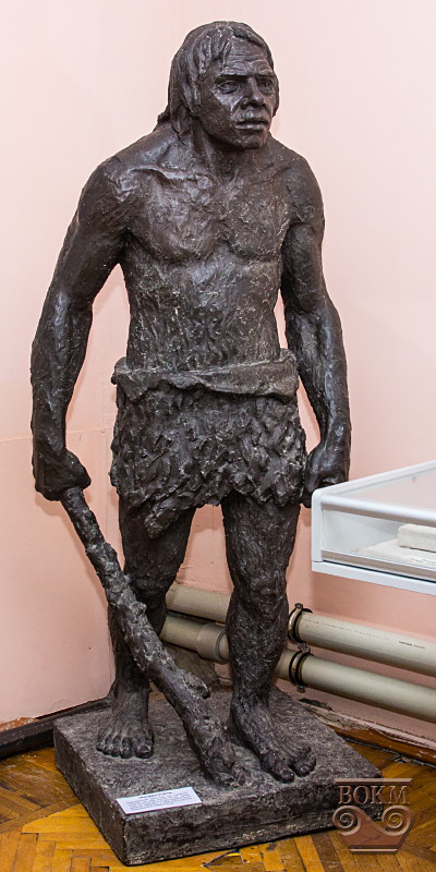 Скульптура неандертальця дає уявлення про фізичний тип людини, що існував понад 40 тис. р. тому. У вітрині поруч розміщені пізньопалеолітичні знаряддя праці з кременю – ручні рубила, різці, пробійник. Увагу привертає реконструкція пращі – ручної метальної зброї.